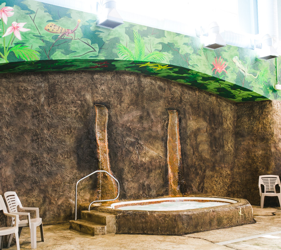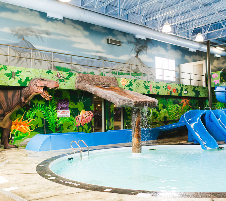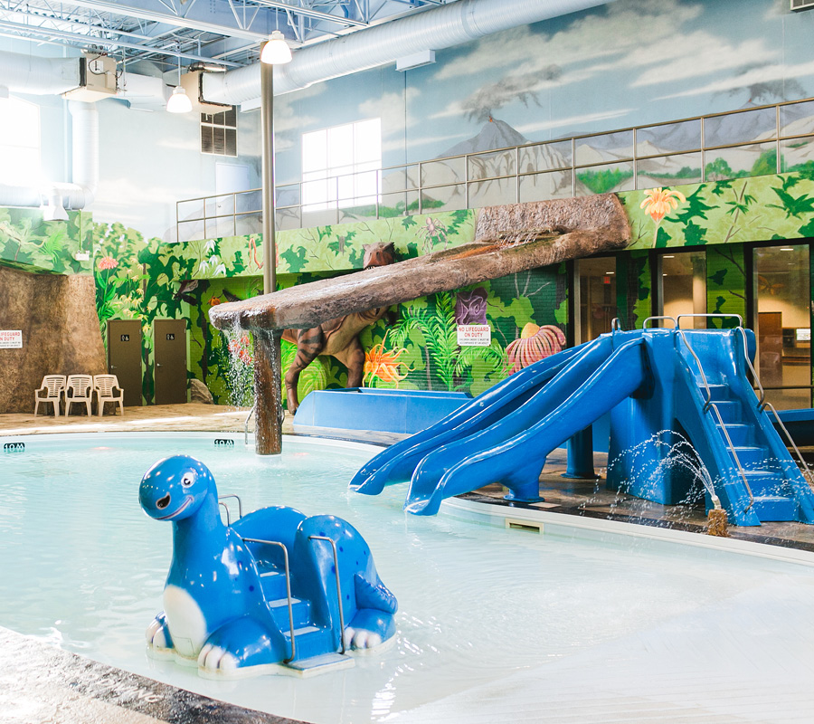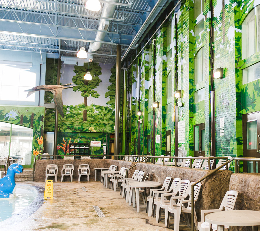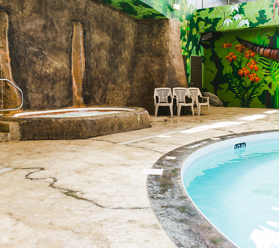 Unique to our Winnipeg hotel, Dino Beach Pool & Waterslide will transport your family back in time to the Jurassic period. Surrounding the pool are murals of trees and volcanoes enhanced with two life-sized 3-dimensional dinosaurs and a rock façade surrounding the beach style pool entryway.